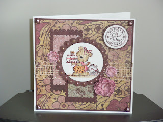 I like the paper combination on this card and it was only my second attempt at this type of card. Stamps are from LOTV and the papers came from Costco. Image is coloured with watercolour pencils. Finished with a piece of raffia lace, flowers, buttons and pearl hearts. I've used several Spellbinder dies in the construction.