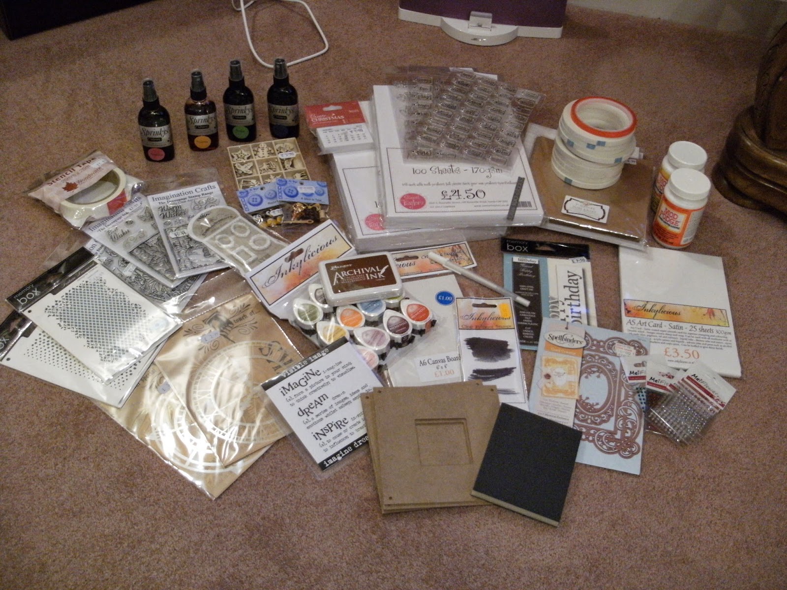 White card, 7" card blanks, modpodge, double sided tape, gems, a couple of dies, a small canvas, inks, mdf blanks, stamps, stencils, buttons, wooden shapes, gel pen, calender stubbs, sanding thingy and some spray paints.