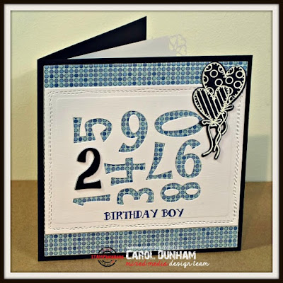 I've used the largest of the Crazy Double Running Stitch Rectangle Nesting Dies and cut the Number Plate Die from it's centre....then added several more number 9's to layer up. The image and half the sentiment is from Tweet Love with the image being die cut with the coordinating die. The other half of the sentiment is from Kathryn's Big Wishes stamp set.